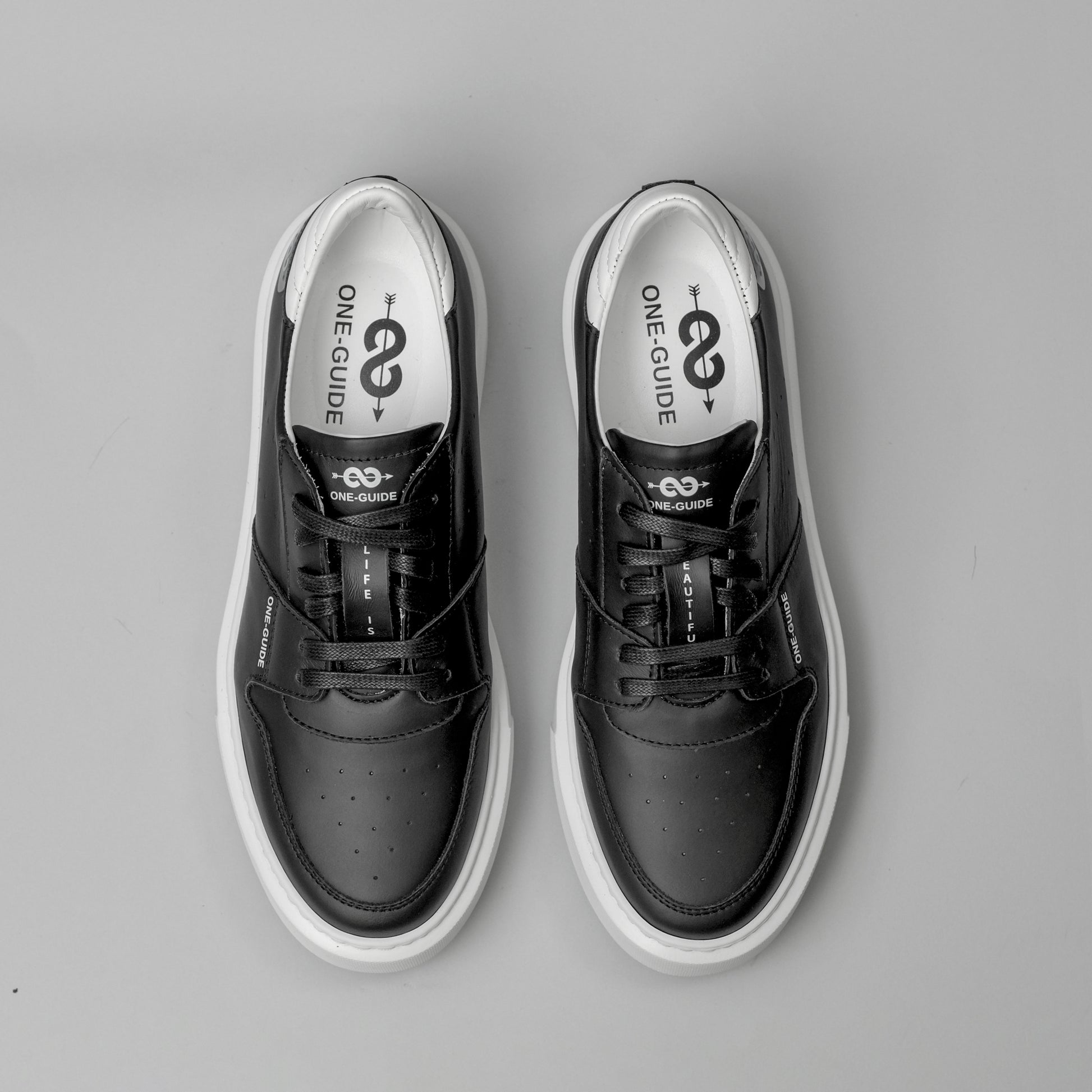 Il logo e la scritta ONE-GUIDE sono impressi sulla linguetta, i lacci di colore nero sono in cotone cerato, sul passa lacci è impresso il motto "LIFE IS BEAUTIFUL". Lateralmente la Sneaker presenta un Tag e la scritta ONE-GUIDE, il talloncino posteriore è in pelle bianca ed internamente è foderata in pelle.