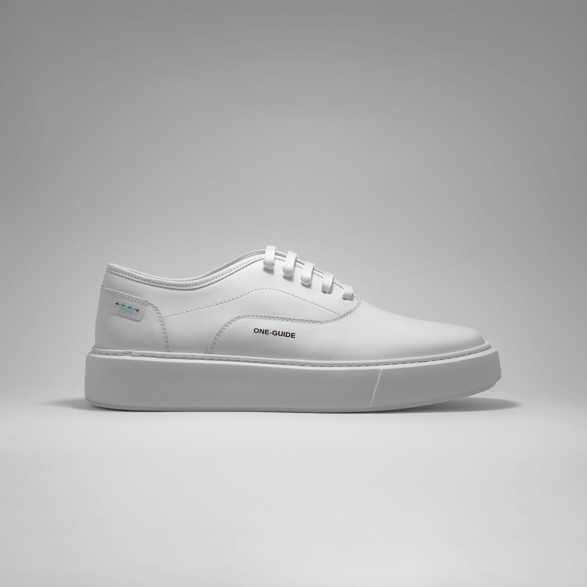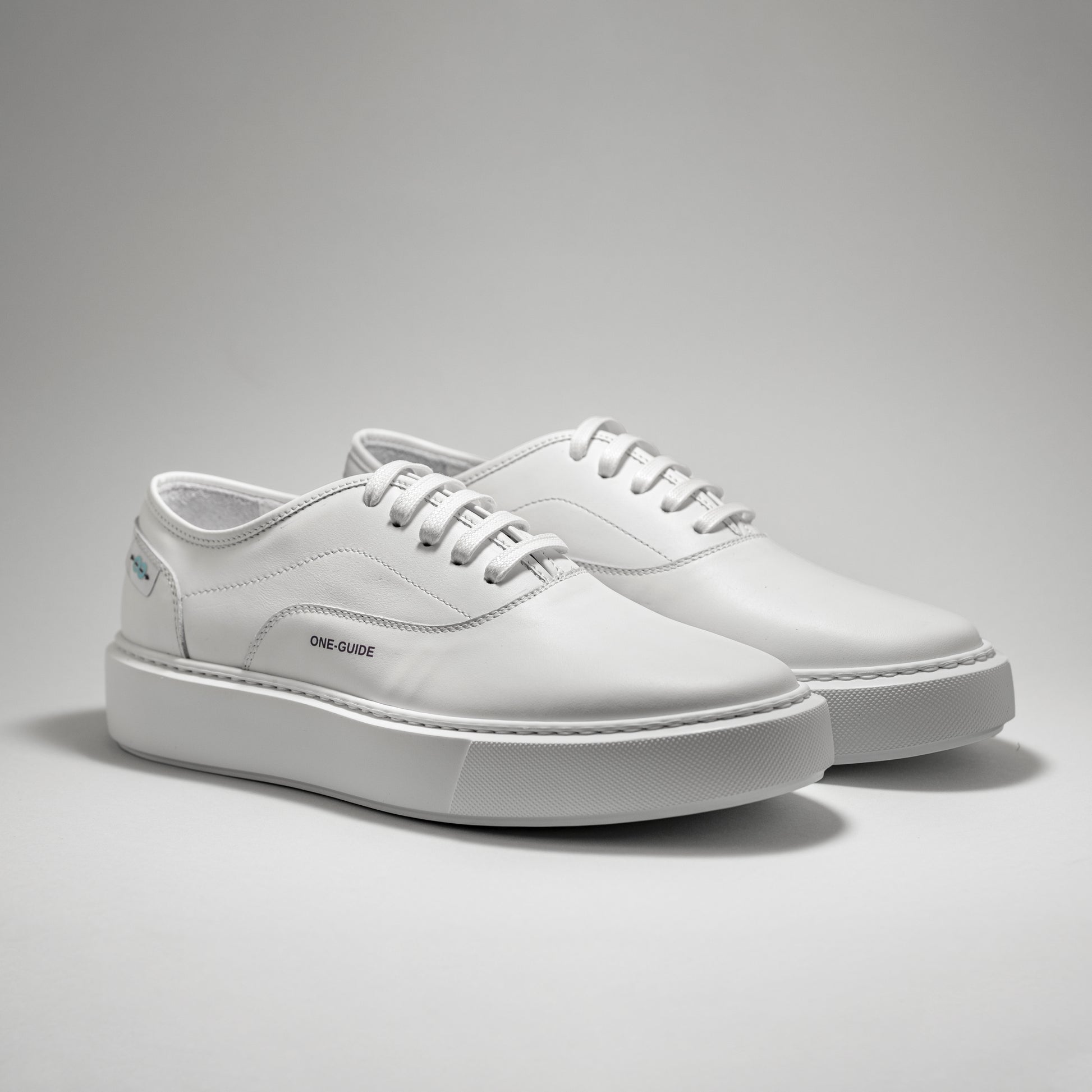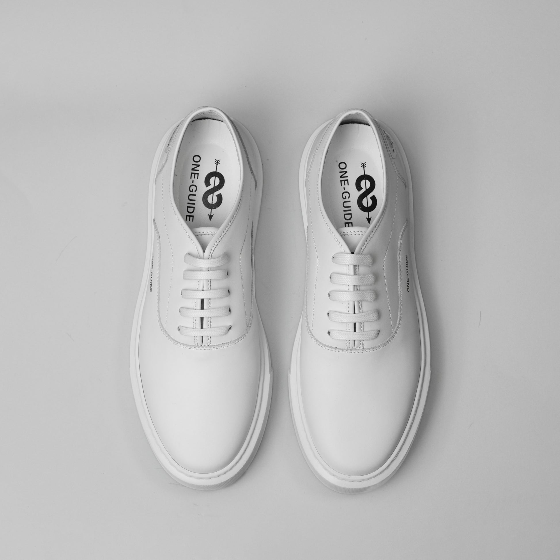 Il logo e la scritta ONE-GUIDE sono impressi sulla linguetta, i lacci di colore bianco sono in cotone cerato. Lateralmente la Sneaker presenta un Tag e la scritta ONE-GUIDE ed internamente è foderata in pelle.