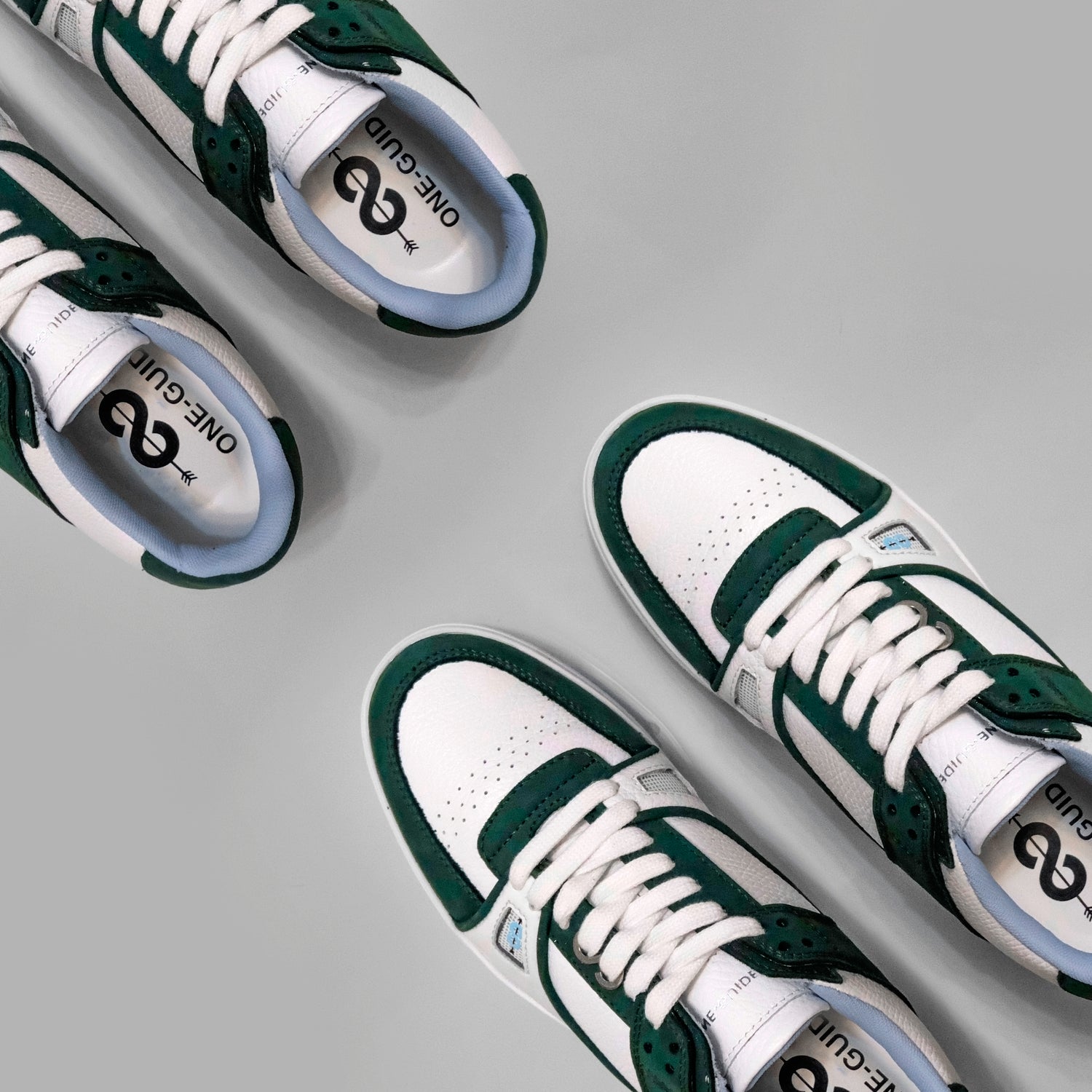 Lateralmente è presente il logo ONE-GUIDE, i lacci di colore nero sono in cotone cerato, sul talloncino è impresso il motto "LIFE IS BEAUTIFUL". Lateralmente la Sneaker presenta un Tag ONE-GUIDE.