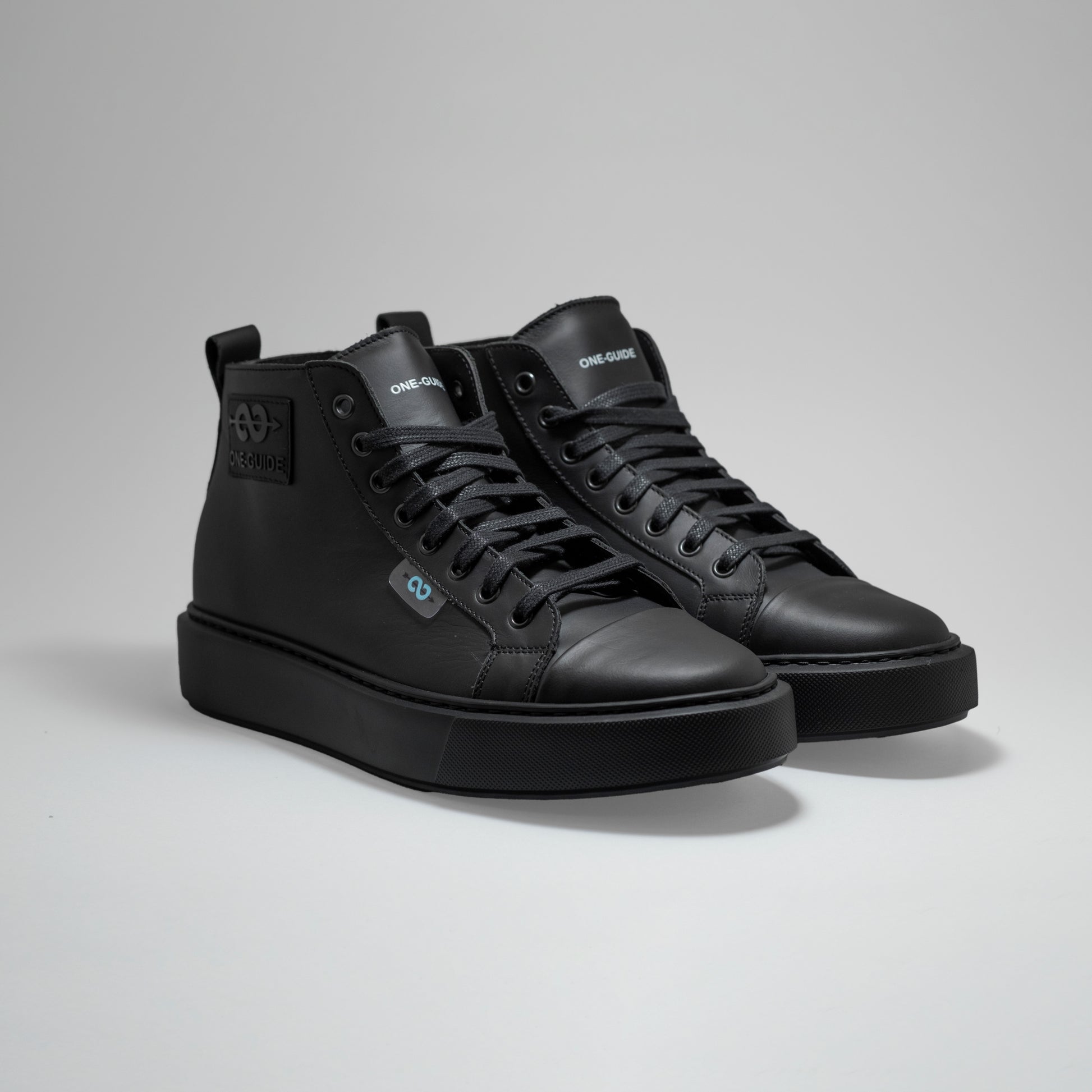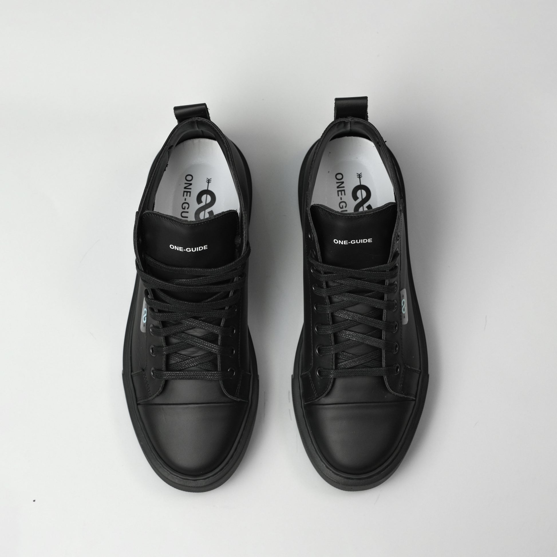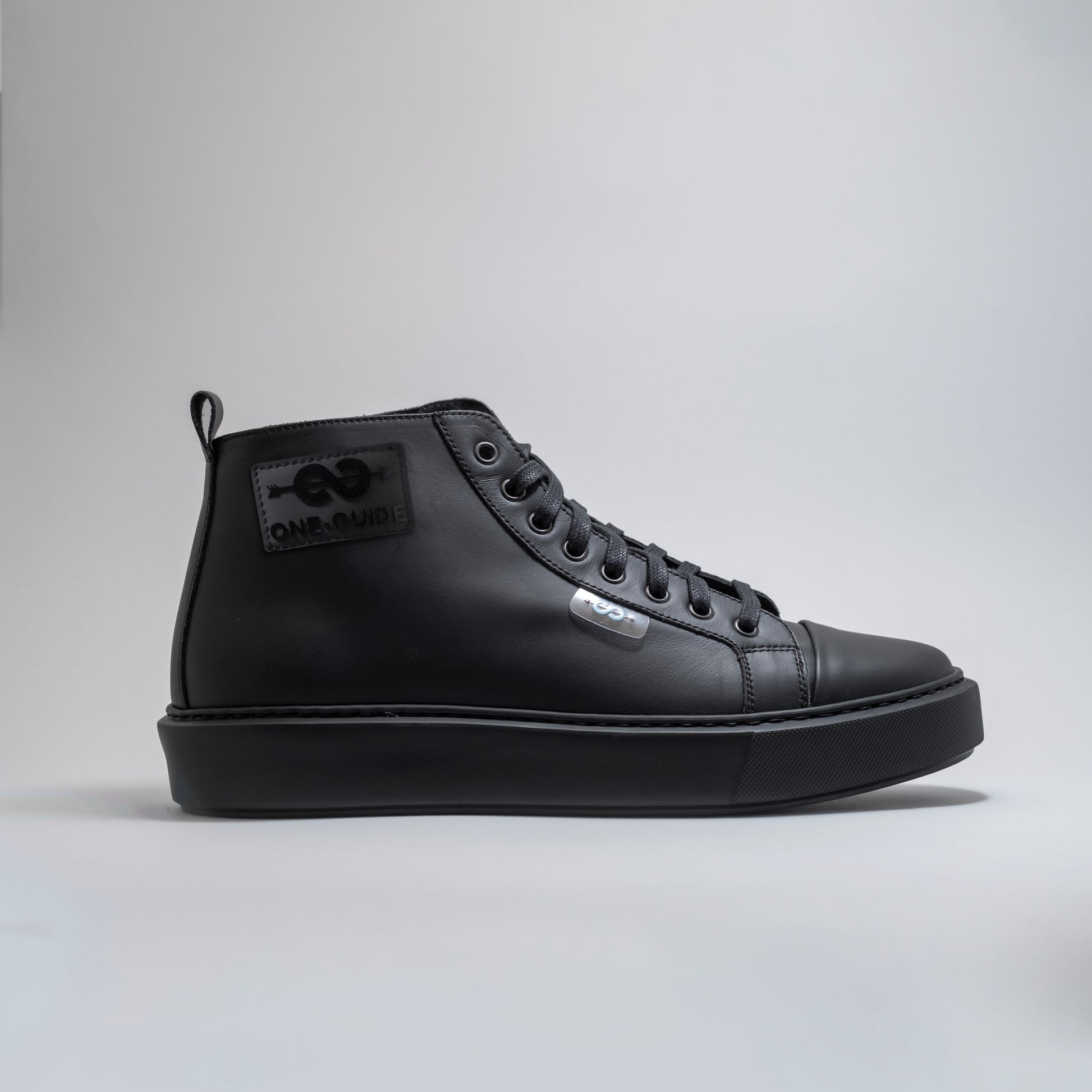 La Sneaker MIRAGE Black, della nuova collezione ONE-GUIDE è un prodotto Made in Italy realizzato completamente a mano che presenta una tomaia in pelle nera, una soletta antishock estraibile ed una suola in gomma super confortevole e leggera realizzata in XL EXTRALIGHT, materiale innovativo ultra leggero.