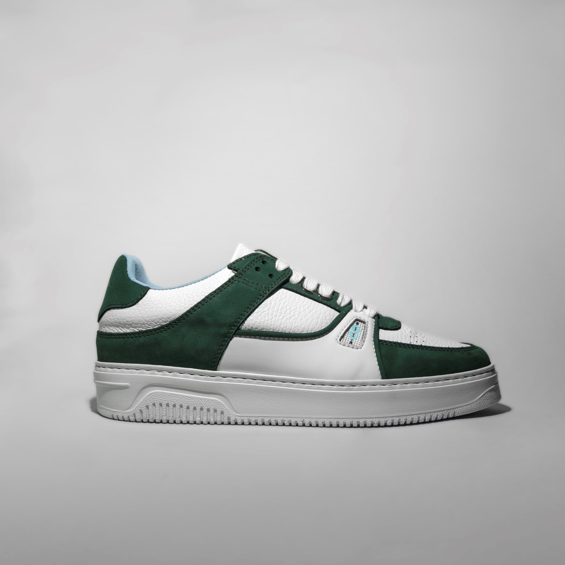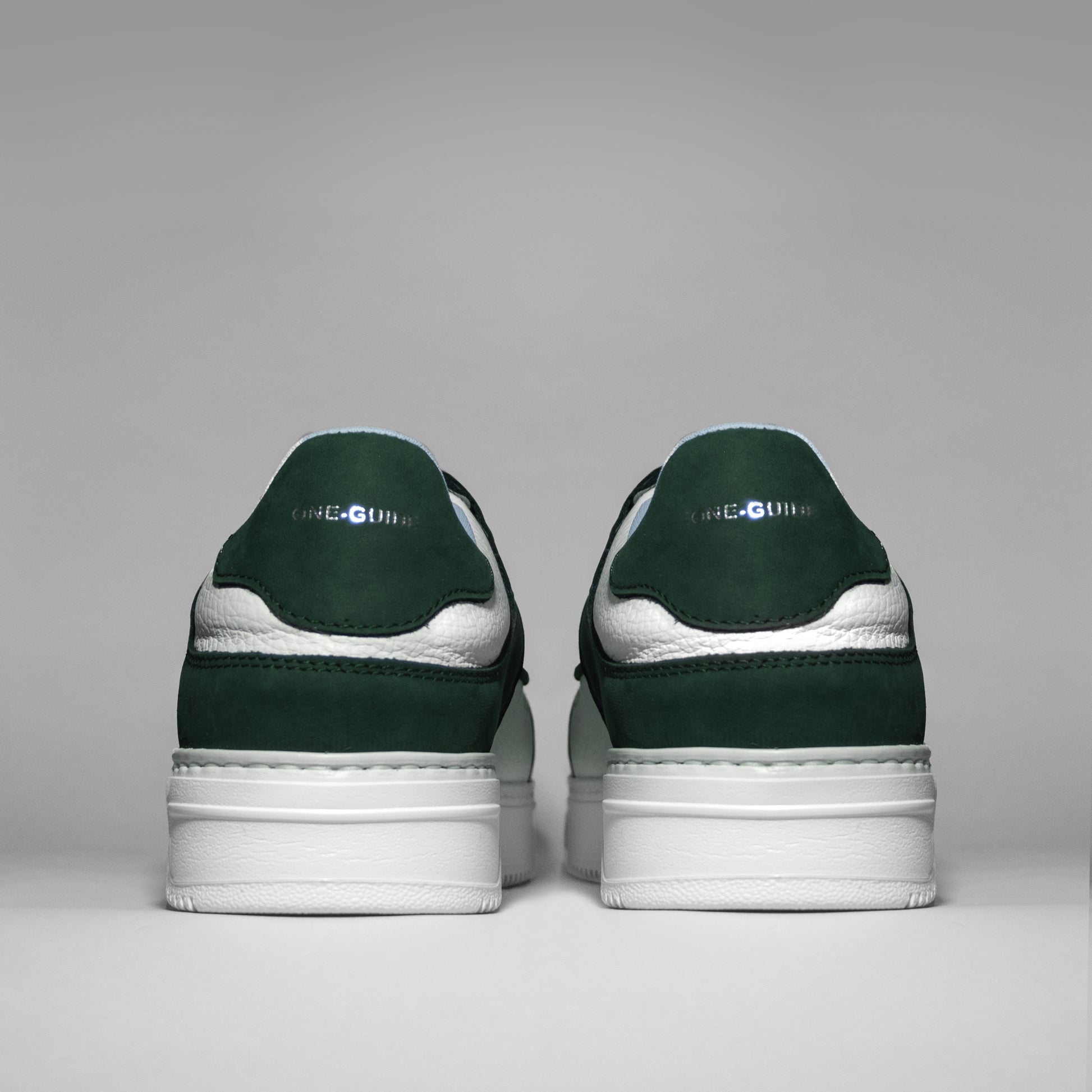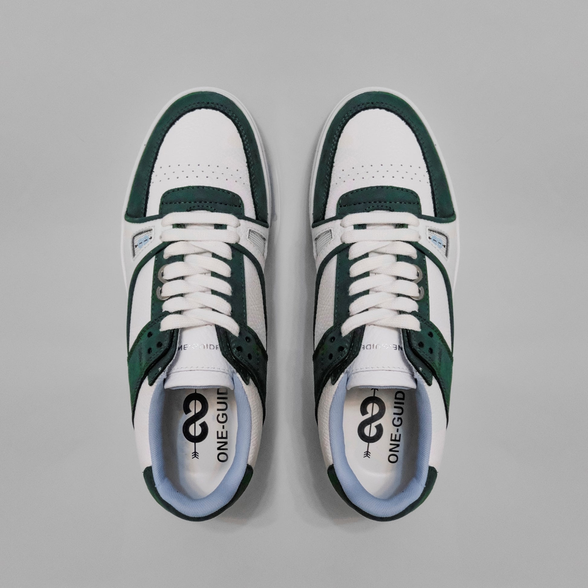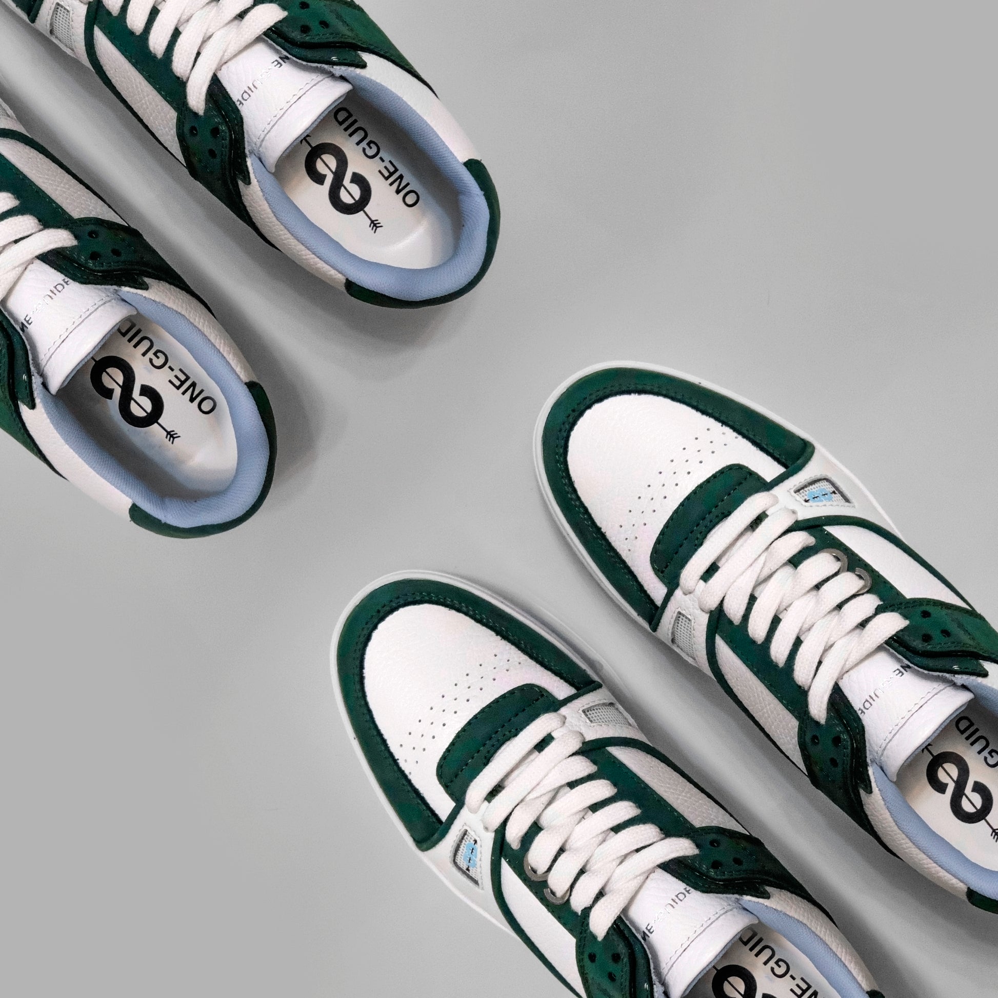 La sneaker OG SKY è proposta con un accostamento di tre materiali differenti, pelle di vitello martellata, pelle Nabuk e lateralmente rivestita con una ricercata microfibra verniciata, che richiama nelle finiture interne la colorazione del Nabuk, ogni sneakers presenta un accattivante infinito in ottone nichelato, segno distintivo della casa di moda ONE-GUIDE. Il modello OG SKY, ideato da i fratelli Guidone, prende ispirazione dalle scarpe di basket L'innovativa suola in Eva, completa l'accattivante calzatura..